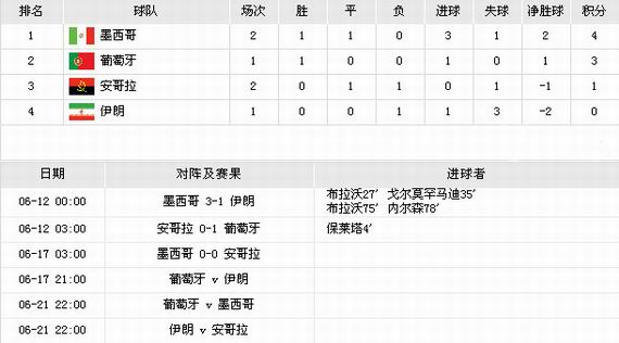 尽管场上只有10个人,安哥拉队还是在第二轮小组赛中顽强地以0:0逼平了墨西哥队,他们保住了非洲球队在世界杯上的尊严。D组的局势本应该十分明朗,但是随着一场平局的出线也让最后的悬念留到了第三轮。目前墨西哥在多赛一场的情况下仍然以积4分排在小组第一,假设在接下来的比赛中葡萄牙战胜了伊朗,那么理论上安哥拉还有出线的可能。