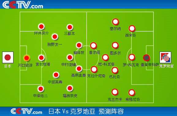 CCTV.com消息(专稿):北京时间6月18日傍晚9点整,第18届世界杯F组的第三场比赛将在巴伐利亚城市纽伦堡进行,比赛的双方是亚洲冠军日本队和欧洲强队克罗地亚队。本场比赛是本届世界杯F组小组赛的第三场,在前面的两场比赛中,日本及克罗地亚分别以1比3及0比1不敌澳大利亚及巴西,出线形势对他们两队来说非常不利。比赛对于两队来说都非常重要,如果哪支球队输掉了这场比赛,那幺他们将被提前宣告出局,即使是平局,对两队来说也是非常不利的,尤其是对于日本,因为他们在小组赛的最后一场将迎战实力强大的巴西,根本就毫无胜算。因此,本场比赛可以说是关系着两队生死的关键战役,两队都会拼尽全力争胜。根据德国《踢球者》杂志的预测,日本队将由加地亮、小笠原满男代替上一场比赛首发的坪井庆介和驹野友一。克罗地亚则不会改变第一场比赛的阵容。《踢球者》对双方的首发阵容预测如下: