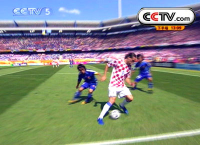 上半场比赛开始。2分钟,日本队中村俊辅发出的任意球就给克罗地亚队门前制造了一些混乱。随后,克罗地亚队反击,克拉尼查尔的射门北门将得到。13分钟,克拉什尼奇的射门被后卫挡出。14分钟,中田英寿的调射偏出。19分钟,克罗地亚队球传入禁区,克拉什尼奇没有抢到第一点。21分钟,克罗地亚队球员普尔绍在禁区内被日本球员宫本恒靖拉倒,裁判对宫本恒靖出示了黄牌并判罚点球,但是,斯尔纳的点球射门被日本队门将川口能活扑了出去!