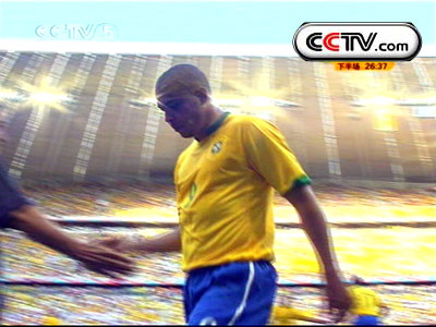 CCTV.com消息:下半场26分钟,罗纳尔多被换下来,埃默森也被换下来,目前巴西队注入了两股活力.换上罗比尼奥和吉尔贝托·席尔瓦.