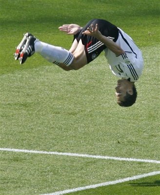 克洛泽再次在进球后采取了空翻的庆祝动作,这是他在重大比赛中进球后的标志性动作。到目前位置他已经累计打进了9个世界杯比赛进球。详情进入