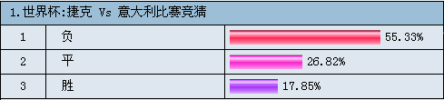 捷克上仗没能取胜本场将死拼对手,而且现在队中受伤停赛的球员太多,使得小组出线不容乐观,就算有心杀敌,但可能实力的原因会最终落败。意大利现在伤员都已经痊?,可以弥补队中的多个薄弱位置,意大利队上轮同样遭到美国队的顽强抵抗,1比1被美国队逼平,今仗两队势必会为小组出线全力一拼,人员齐整的蓝衣军团将是相当的可怕。