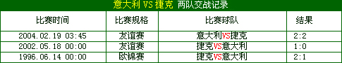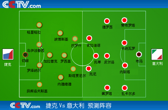 捷克上仗失利,想要出线,此战必须获胜,但现在队中多名主力停赛或有伤病,特别是前锋线,扬.科勒尔和弗拉迪斯拉夫.洛克文茨(洛云斯)都不能出场,只剩下斯塔贾尼尔一人,巴罗什是否能够出场还很难说,因为受伤原因的他刚刚恢复,而从上仗他替补出场的表现来看,他的实力只属一般,想靠他来撕开意大利的防线有点困难。而后卫托马斯.乌伊法鲁西(乌费路斯)也因得到红牌本场不能出战,前后场都有大将缺阵,这对急需胜利的捷克来说是非常不利的。中场线将是球队发起进攻的重点,中场帕维尔.内德维德(尼维特)和托马斯.罗斯基(鲁锡斯基)的攻击力属一流水平,能否取胜就看他俩了。