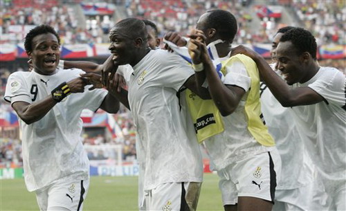 新浪体育讯:第一轮小组赛过后,五支闯入世界杯决赛圈的非洲球队1平4负,唯一一场平局对手还是亚洲球队沙特,用“惨不忍睹”来形容非洲军团首轮的表现毫不夸张。第二轮第一个亮相的科特迪瓦又败在荷兰脚下,黯然告别世界杯,安哥拉虽然逼平了墨西哥,但是出线希望已经不掌握在自己手中。就在非洲球队呼唤胜利的时候,加纳登场了。2-0战胜捷克,非洲球队终于取得了本届世界杯上的第一场胜利,第一个3分。