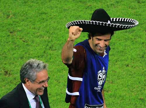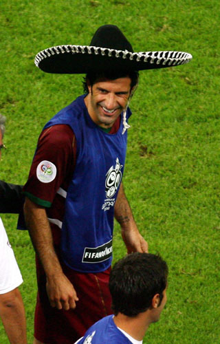 新浪网消息:北京时间6月21日晚22时,06德国世界杯小组赛D组第三轮两场比赛同时开打,其中葡萄牙和墨西哥的比赛在盖尔森基兴的沙尔克球场展开,结果葡萄牙凭借马尼切和西芒的进球2-1力克墨西哥,J-丰塞卡为墨西哥打进一球,葡萄牙和墨西哥晋级16强。图为菲戈头戴墨西哥草帽。