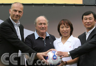 央视国际消息(记者宋璐柏林报道):德国当地时间6月22日,男足世界杯正在如火如荼的进行,而今天,被国际足联临时定名为“女足日”。国际足联主席布拉特在柏林宣布了2007年女足世界杯的官方用球。