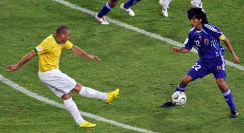 CCTV.com消息:肥罗终于进球了。在北京时间今天凌晨进行的最后一场对阵日本队的小组赛中,巴西队前锋罗纳尔多独中两元,这样,他在世界杯上的总进球数与德国的穆勒持平,创造新记录只有一步之遥。