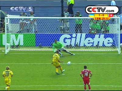 70分钟 ,乌克兰总算取得领先,突尼斯队员出现致命失误,首先是15号贾伊迪胸部想停给门将,停的不够大,不够远,舍甫琴科正好顺势追进来,把球一趟,其实这个球是向底线趟过去,但是追过来的卡利姆忙中出错,急不可待的拉了舍甫琴科,点球,舍甫琴科主罚命中,1:0。
