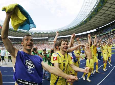 搜狐体育消息:北京时间6月23日晚,06德国世界杯小组赛H组最后一轮比赛拉开战幕,舍甫琴科率领的乌克兰队在柏林的奥林匹克体育场与突尼斯队进行比赛。图为舍甫琴科和队友庆祝。