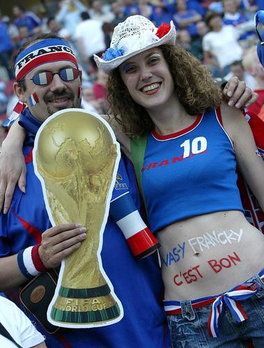 图文:法国VS多哥 法女球迷与大力神杯合影