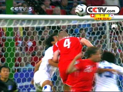 23分钟,瑞士取得进球,雅金右侧主罚任意球左脚斜传后点,森德罗斯在小禁区边缘甩头顶进右下角,瑞士1比0领先!森德罗斯攻门时与崔辰哲头部相撞,鼻梁骨撞伤鲜血直冒,但仍然兴奋得狂奔庆祝。随后他到场外接受紧急处理,崔辰哲右眉骨也被撞破出血,到场边止血后戴上了保护头套。