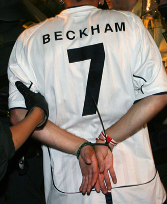 新浪体育消息:北京时间2006年6月24日,德国斯特加特警方逮捕了数名在此闹事的英格兰球迷,原因是他们与德国球迷发生争执后大打出手。图为英格兰球迷被警方带走。
