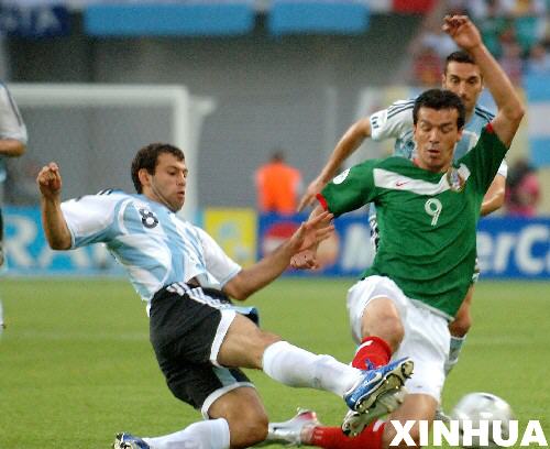 新华网消息:6月24日,第十八届世界杯足球赛八分之一决赛阿根廷队与墨西哥队的比赛在德国莱比锡的中央体育场举行。 最终,阿根廷队通过加时赛2:1战胜墨西哥队。