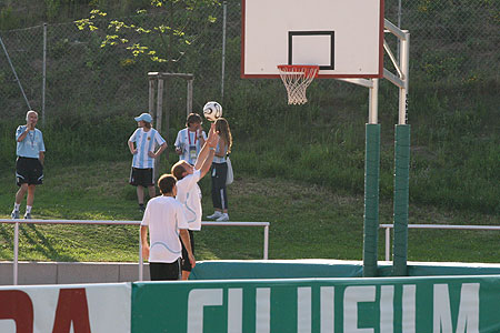 放松训练结束后,球员们各自选择自己的娱乐方式,有的冲向场边的家人,抱起女儿共享天伦,有的在场上摆弄两脚脚法,坎比亚索更是有新意,居然和队友来到篮球场较量起篮球,看来阿根廷的篮球普及还是很有效的,难怪人家的篮球队也很强。