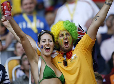 新浪体育消息:北京时间6月26日23时,06世界杯第五场1/8决赛将在凯泽斯劳滕举行,意大利队在弗里茨-瓦尔特体育场迎战澳大利亚队。图为澳大利亚球迷在现场助威。