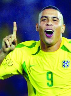 1.1998年法国世界杯,罗纳尔多在与摩洛哥的比赛中射进他的第一粒世界杯入球。2.2002年韩日世界杯,罗纳尔多庆祝在决赛梅开二度。