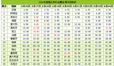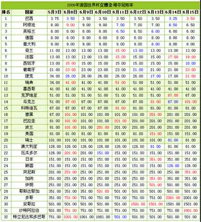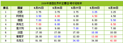 夺冠赔率6月30日--2006德国世界杯立博公司