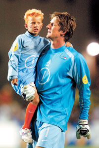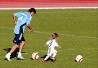 北京晨报消息:{1}父子帅哥——贝克汉姆与儿子罗密欧在训练场上。