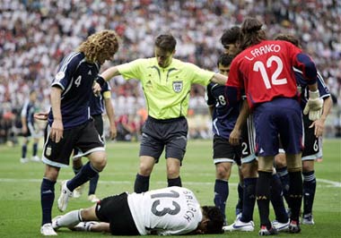 当德国队用完3个换人名额时,队长巴拉克不得不咬牙坚持比赛。他在加时赛时在场边接受短暂治疗,然后立刻回到场上继续进行比赛。在点球决胜的关键时刻他信心十足,挺身而出,踢进了第2个点球。(赵亮)