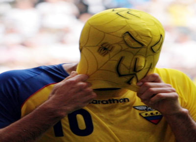 激情一刻,进球瞬间,激情澎湃。他们是英雄,尽情释放着自我魅力。在本次世界杯中,各种独特的庆祝方式呈现了这场饕餮大餐的丰富和足球文化的多元。 这是6月15日厄瓜多尔队球员卡维德斯戴上蝙蝠侠面具庆祝进球。当日,厄瓜多尔队在小组赛中3比0战胜哥斯达黎加队。新华社发