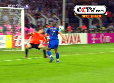 第40分钟,卡莫拉内西接到皮尔洛的传球,头球攻门偏出,今天德国队禁区内的头球防守不是很好,意大利队多次抢到第一点攻门。上半场最后阶段双方都没有取得什么机会,0:0进入中场休息。