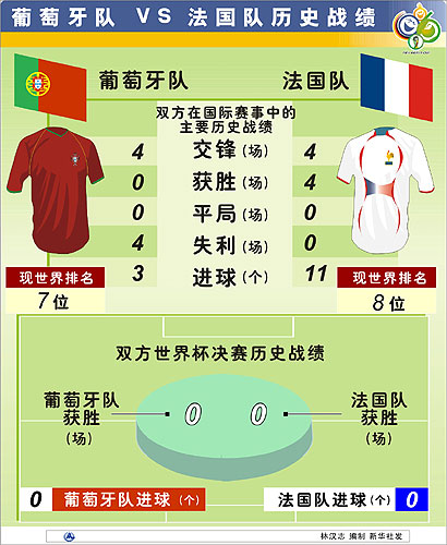 葡萄牙队与法国队是一对老对手,历史上双方共交手19次,不过17次比赛是友谊赛,只有两次正式的国际大赛比赛记录。1984年欧洲杯赛,法国队3:2胜葡萄牙队;2000年欧洲杯赛,葡萄牙队1:2负于法国队。两队最近的一次友谊赛是在2001年,当时葡萄牙队0:4惨败给对手。详细内容*****