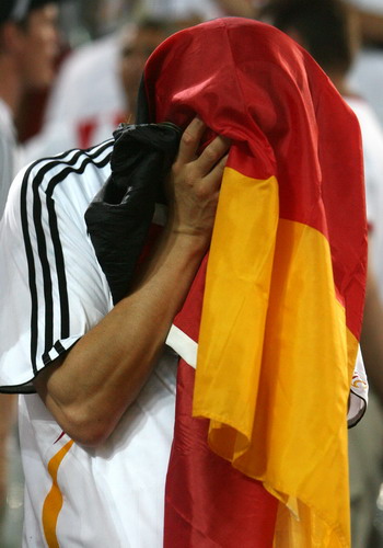 新浪体育消息:北京时间7月5日凌晨三点,德国世界杯首场半决赛在多特蒙德举行,东道主德国队在多特蒙德威斯特法伦体育场迎战意大利队。意大利队凭借加时赛下半场格罗索和皮耶罗的进球以2-0击败德国队,意大利队将在决赛中对阵法国和葡萄牙之间的胜者。图为失落的德国球迷现场。