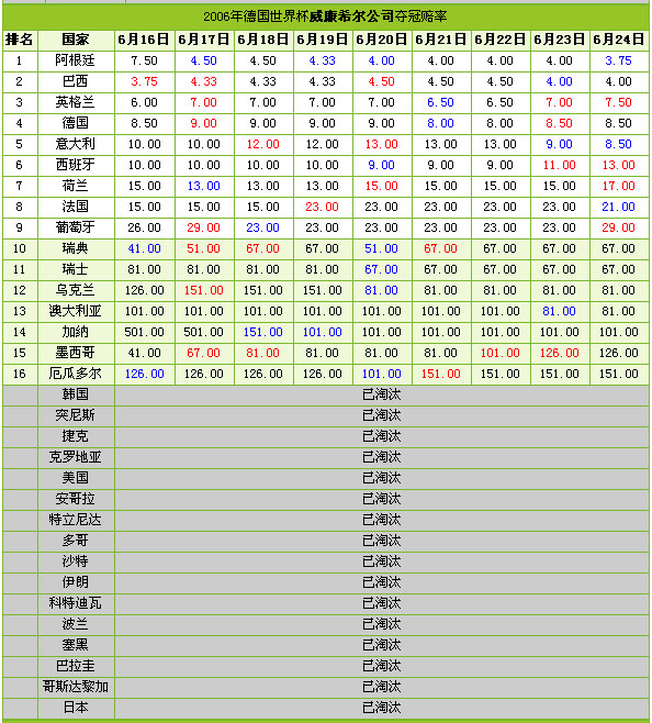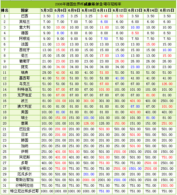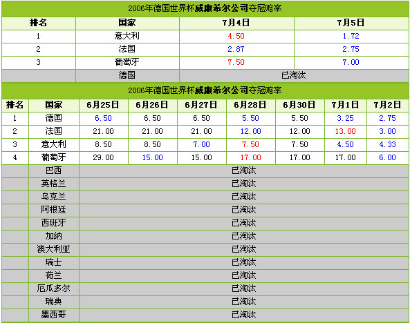 2006德国世界杯威廉希尔夺冠赔率(7月5日)