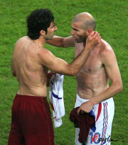 最后当里卡多放弃了自己的大门,出现在菲戈身边的时候,他已经觉察到了最后的结果。当终场的哨音最后响起,齐达内走过来,他们拥抱在一起,接着他们同时褪下队长的袖标,互换球衣,这件球衣,是他们世界杯赛场上的最后一件球衣。