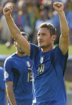 据巴西《大地》网7月6日报道,意大利队将在9日的决赛中与法国队争夺本届世界杯的冠军。队中主力球员托蒂日前表示,意队队员们有十足信心战胜法国队。他说:“意大利队是一支团结的队伍。我觉得它现在就已经是一支冠军队了。足球比赛既有场内因素又有场外因素。我敢保证,意大利队肯定将是世界冠军。”