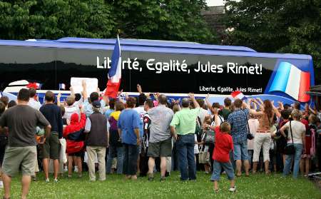 搜狐体育消息:北京时间2006年7月10日凌晨,2006德国世界杯决赛将在柏林上演,由意大利迎战法国队。图为意大利备移师柏林,当地的球迷为意大利队送行的精彩瞬间。