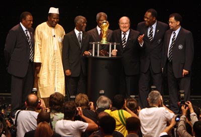 新浪体育讯 柏林当地时间7月7日,南非世界杯组委会在柏林举办一个庆祝会,揭晓了2010年世界杯的标志。国际足联主席布拉特、南非总统姆贝基和联合国秘书长安南都出席了此次活动。图为庆祝会上的精彩瞬间。