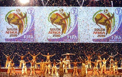 新浪体育讯 柏林当地时间7月7日,南非世界杯组委会在柏林举办一个庆祝会,揭晓了2010年世界杯的标志。国际足联主席布拉特、南非总统姆贝基和联合国秘书长安南都出席了此次活动。图为庆祝会上的精彩瞬间。