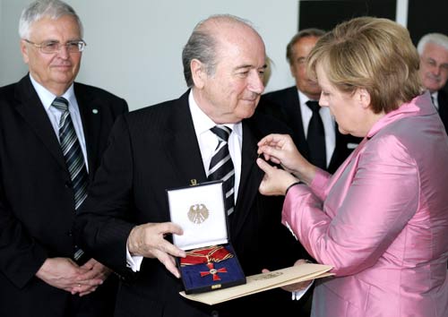 新浪体育讯:德国当地时间7月7日,德国总理默克尔向国际足联主席布拉特授予了德国的最高荣誉——“联邦德国荣誉勋章”,德国世界杯组委会主席贝肯鲍尔也参加了授勋仪式。图为授勋仪式上的精彩瞬间。
