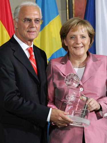 新浪体育讯:德国当地时间7月7日,德国总理默克尔向国际足联主席布拉特授予了德国的最高荣誉——“联邦德国荣誉勋章”,德国世界杯组委会主席贝肯鲍尔也参加了授勋仪式。图为授勋仪式上的精彩瞬间。