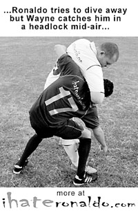 北京晨报消息:英国一些球迷推出了“我恨罗纳尔多”网,专门用来讽刺C·罗。这是该网站制作的搞怪图片,为了讽刺C·罗假摔(英文中假摔与跳水是同一个词),图为模拟鲁尼在训练场暴揍C·罗的情景。