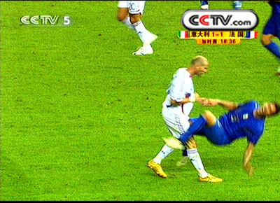 谁也想不到齐达内会一头撞向马特拉齐的胸口,以一张红牌断送了自己的演出,也断送了法国队的前程。亨利换下场,齐达内罚下场,法国队少了两个最有把握的点球射手,还了六年前最后一秒扳平比分欠的债。今天意大利队是靠对方帮忙,度过了艰难的120分钟。