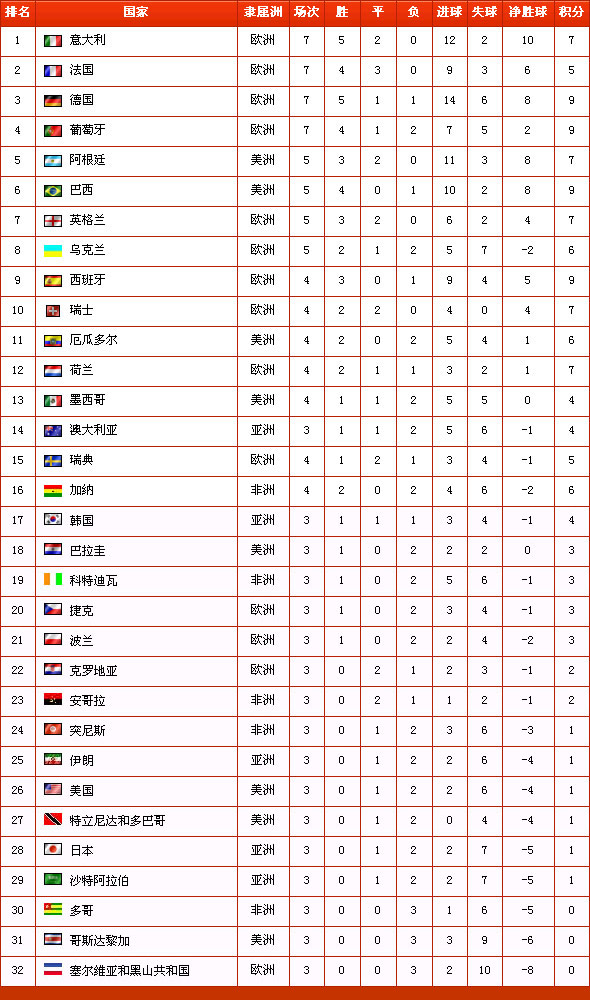 搜狐体育消息:2006年德国世界杯终于在一场极具戏剧性的决赛之后落下帏幕,意大利夺冠,点球大战,齐达内和马特拉齐的功过是非为本场比赛留下了无数值得回味的地方。但勿庸置疑的是德国人举办了一届非常成功的世界杯。下面是本届世界杯各支球队的最终排名:(见下表)