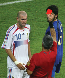 红牌!当主裁判埃里佐多向齐达内举起红牌的一瞬间,柏林奥林匹克体育场陷入了死一样的沉静。法国人没有喝彩,意大利人也没有嘘声。就这样,死一样的沉静。整整16年,齐达内光辉的足球生涯,就在这一张红牌下结束了。