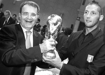 意大利总理普罗迪(左)和夺冠功臣马特拉齐举起大力神杯。