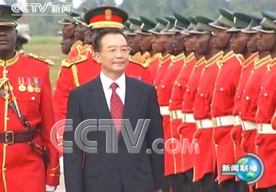 基奎特总统在机场为温家宝总理访坦举行了欢迎仪式。军乐队奏中坦两国国歌,鸣礼炮19响。温家宝检阅了仪仗队。