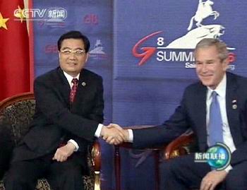 CCTV.com消息(新闻联播):7月16号下午,出席八国集团同发展中国家领导人对话会议的国家主席胡锦涛在俄罗斯圣彼得堡同美国总统布什会晤。双方就中美关系和共同关心的重大国际及地区问题深入交换了意见。