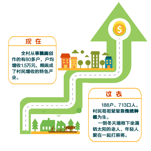 村貌一下子改变了,跟李凤霞一样,全村从事粮画创作的有80多户,户均增收1.5万元,粮画成了村民增收的特色产业。