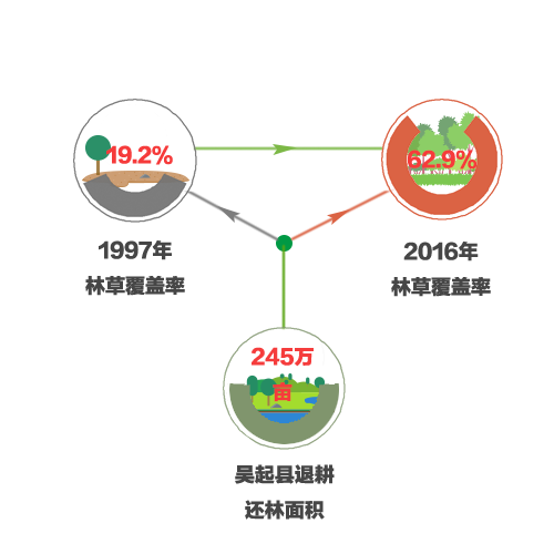 资料显示,截至2015年,18年来,吴起县已累计完成退耕还林面积约245万亩,国家计划确认面积186万亩,先后被授予“全国退耕还林试点示范县”“全国退耕还林先进县”等荣誉,并被列入了“全国生态文明示范工程试点县”。