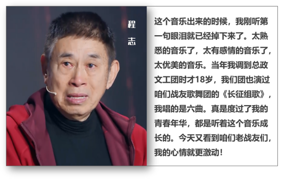 小乐作为节目的幕后人员,也是普通的观众之一,每期都会随着各支团队呈现的特点,情绪高低起伏。复赛第一场,小乐印象最深的就是北京老战友合唱艺术团带来的《长征组歌——四渡赤水出奇兵》,熟悉的旋律一起,内心瞬间充满了感动的情绪。随着节目的进行,让小乐泪奔的画面猝不及防来到眼前。