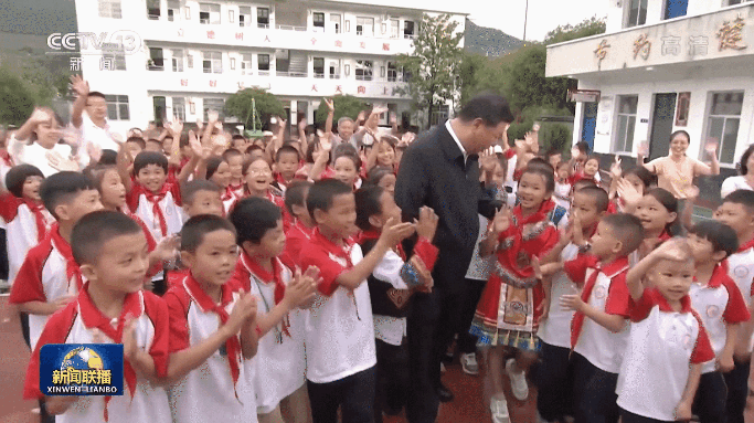 在学生们的簇拥中,习近平总书记走出校园,边走边关切地低头询问身边一名小女孩儿:“家里冷不冷啊?”小女孩儿摇头回答:“不冷。”