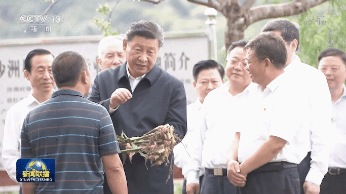 总书记走进田间地头,了解扶贫产业发展和增收情况。过程中,他拿起工作人员递过来的一把小黄姜秧苗,一边看一边细细询问。