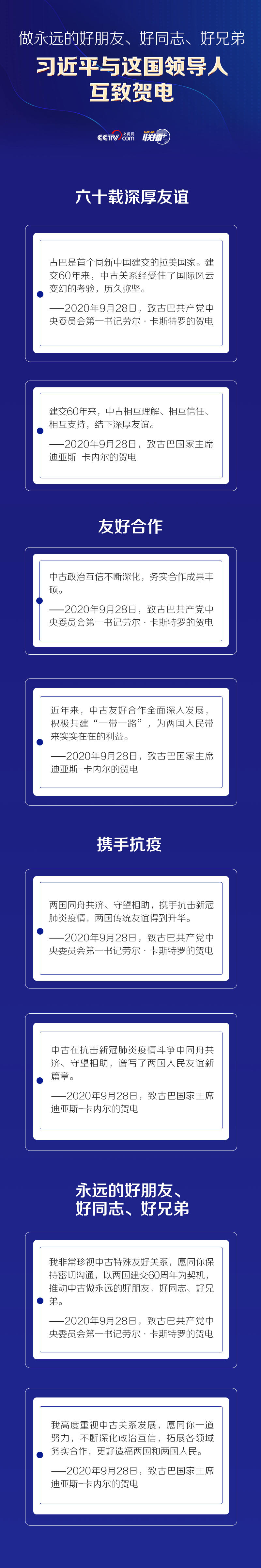联播+9月28日,中共中央总书记、国家主席习近平分别同古巴共产党中央委员会第一书记劳尔·卡斯特罗、古巴国家主席迪亚斯-卡内尔互致贺电,热烈庆祝两国建交60周年。