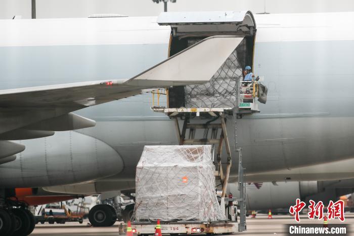 资料图:浦东机场货运停机坪,卸货作业有序进行。 张亨伟 摄