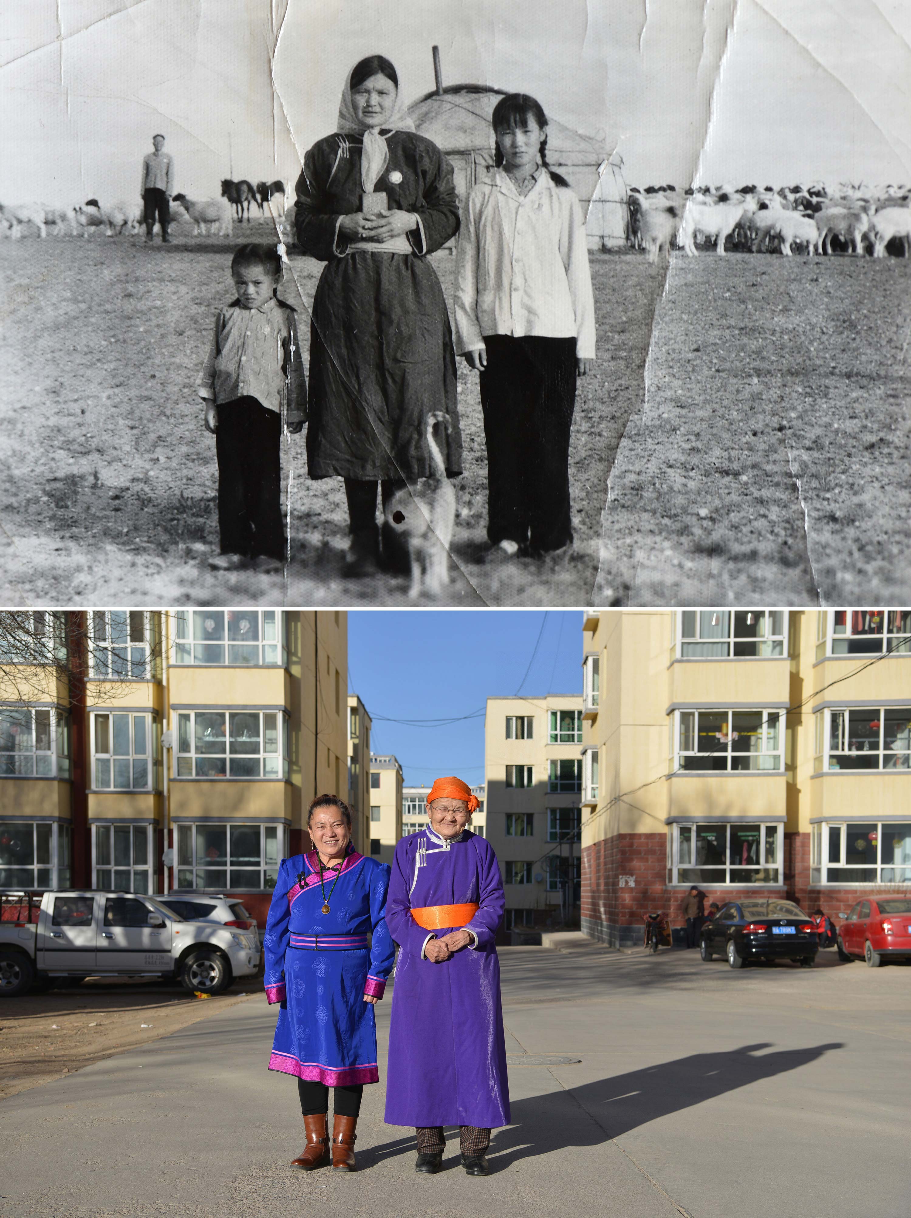 △上图:在内蒙古四子王旗脑木更苏木乌兰希热嘎查,都贵玛(中)和女儿查干朝鲁(左)在她们居住的蒙古包前合影;下图:2018年在内蒙古四子王旗乌兰花镇,76岁的都贵玛(右)和女儿查干朝鲁(左)在自家楼下合影。